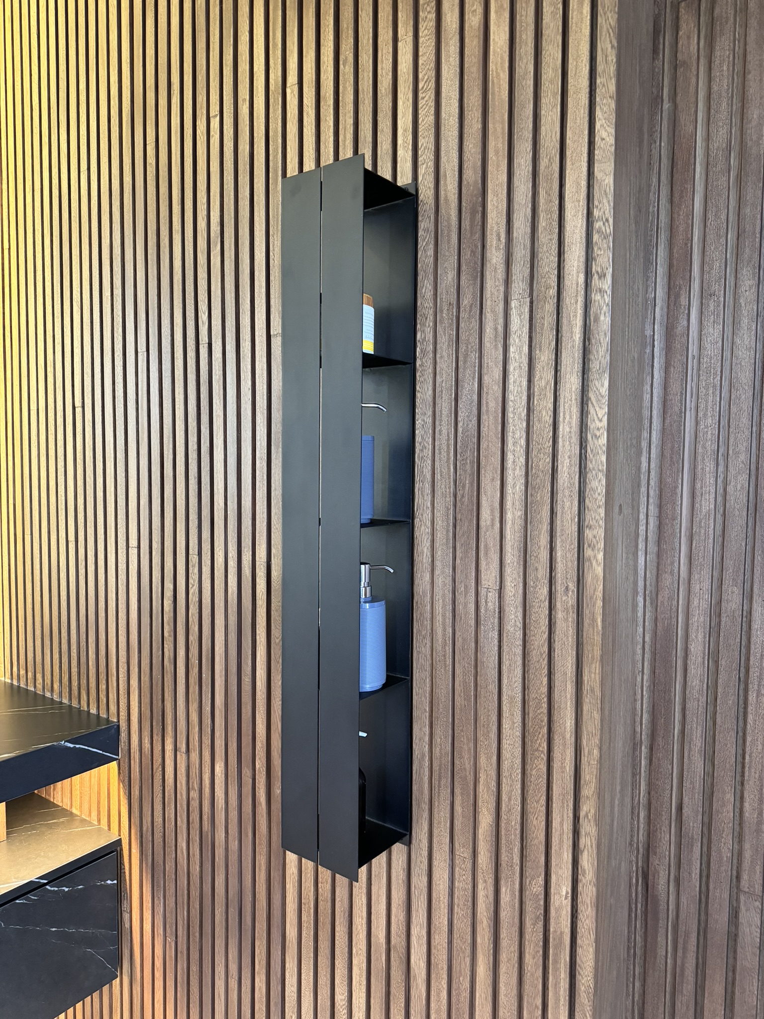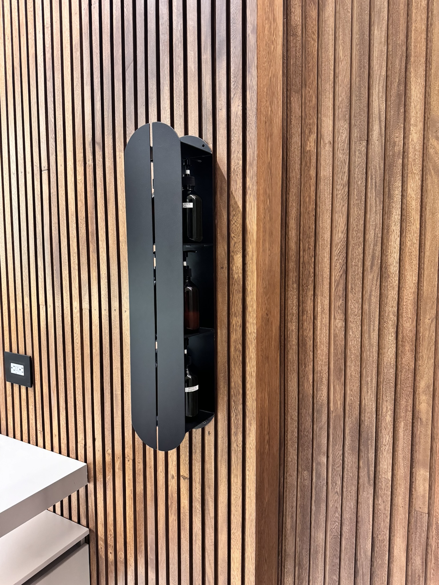 El estante minimalista está diseñado para guardar botellas discretamente.
